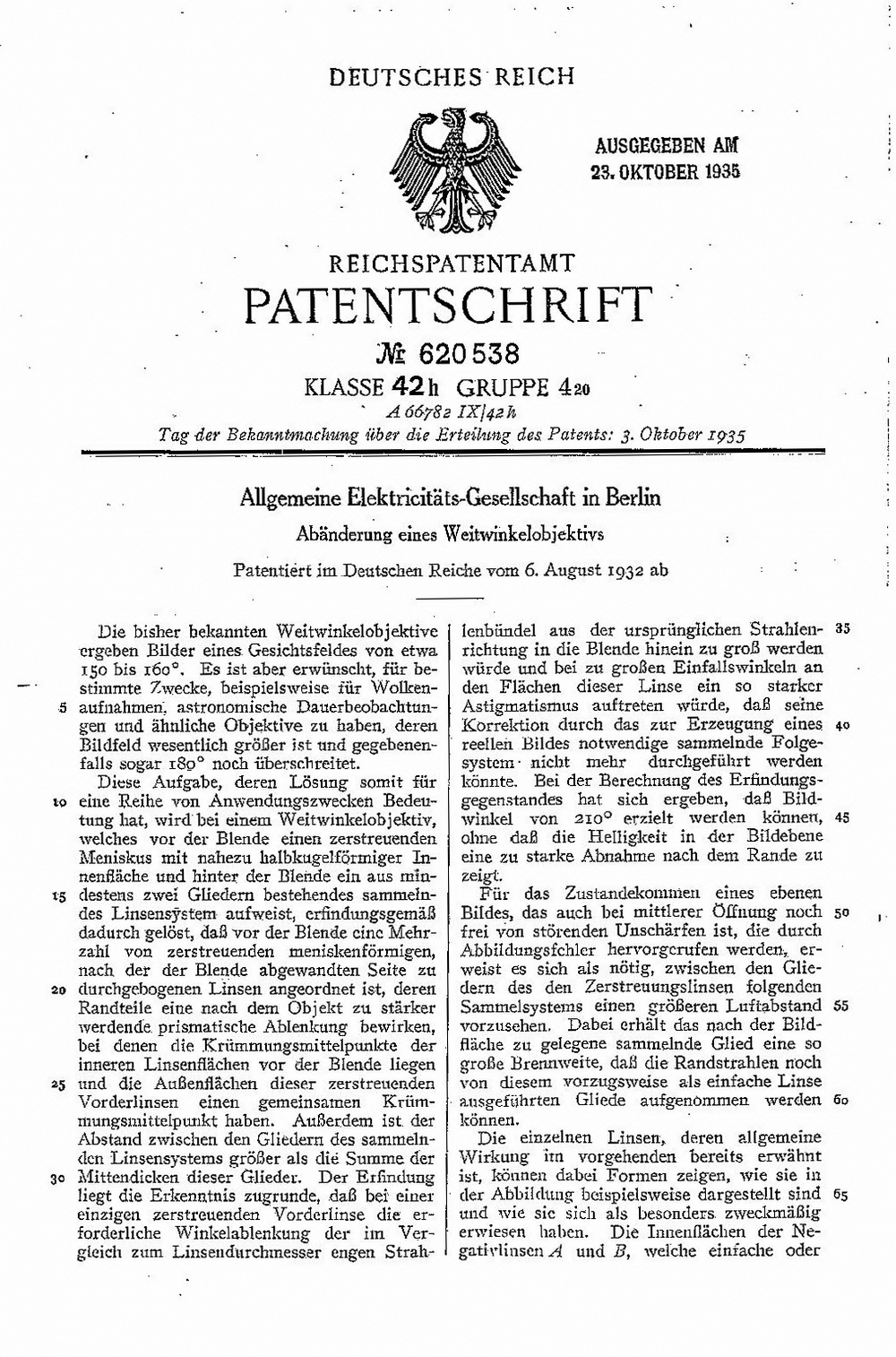 Die optische Berechnung des AEG fisheye stellt den Embryo des modernen Fisheye-Objektivs dar,
